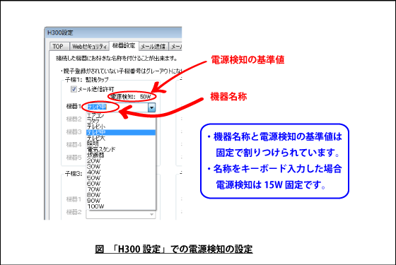 「H300設定」ソフトウェアの「機器設定」タブで、電源ON/OFFの判定基準となる消費電力値を設定することができます。